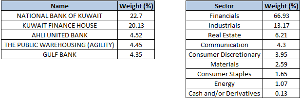 There are 30 companies in the ETF that represent some of the most liquid assets available on the Kuwait Stock Exchange. The three largest constituents are National Bank of Kuwait (22.7%), Kuwait Finance House (20.13%), Ahli United Bank (4.52%). With the exception of Ahli United Bank, all stocks are domiciled in Kuwait.