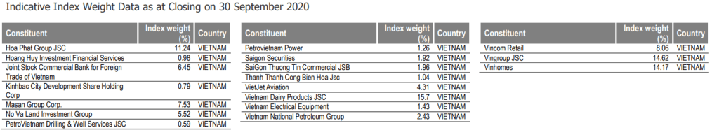 An Phat Holdings (Symbol: APH) will be included in the FTSE Vietnam Index before the end of the year and will join the existing 18 stocks in the index. As of the 30th September 2020, the largest constituents in the Index are Vietnam Dairy Products (15.7%), Vingroup JSC (14.62%) and Vinhomes (14.17%). There is no indication of what APH’s weighting will be.